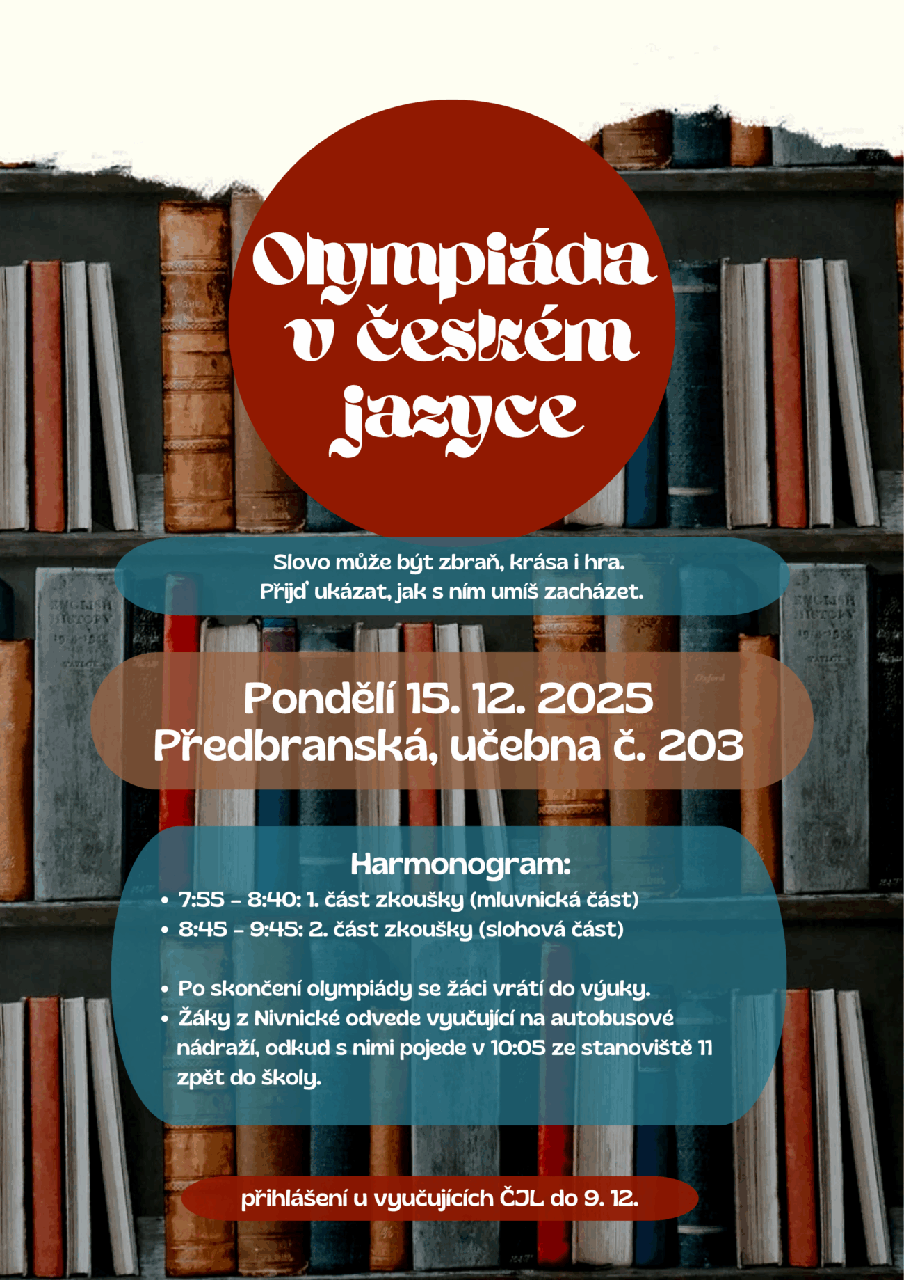 Přijď ukázat, jak umíš pracovat se slovy! Olympiáda proběhne 15. 12. 2025 – všechny podrobnosti najdeš na plakátu. ✍️📖