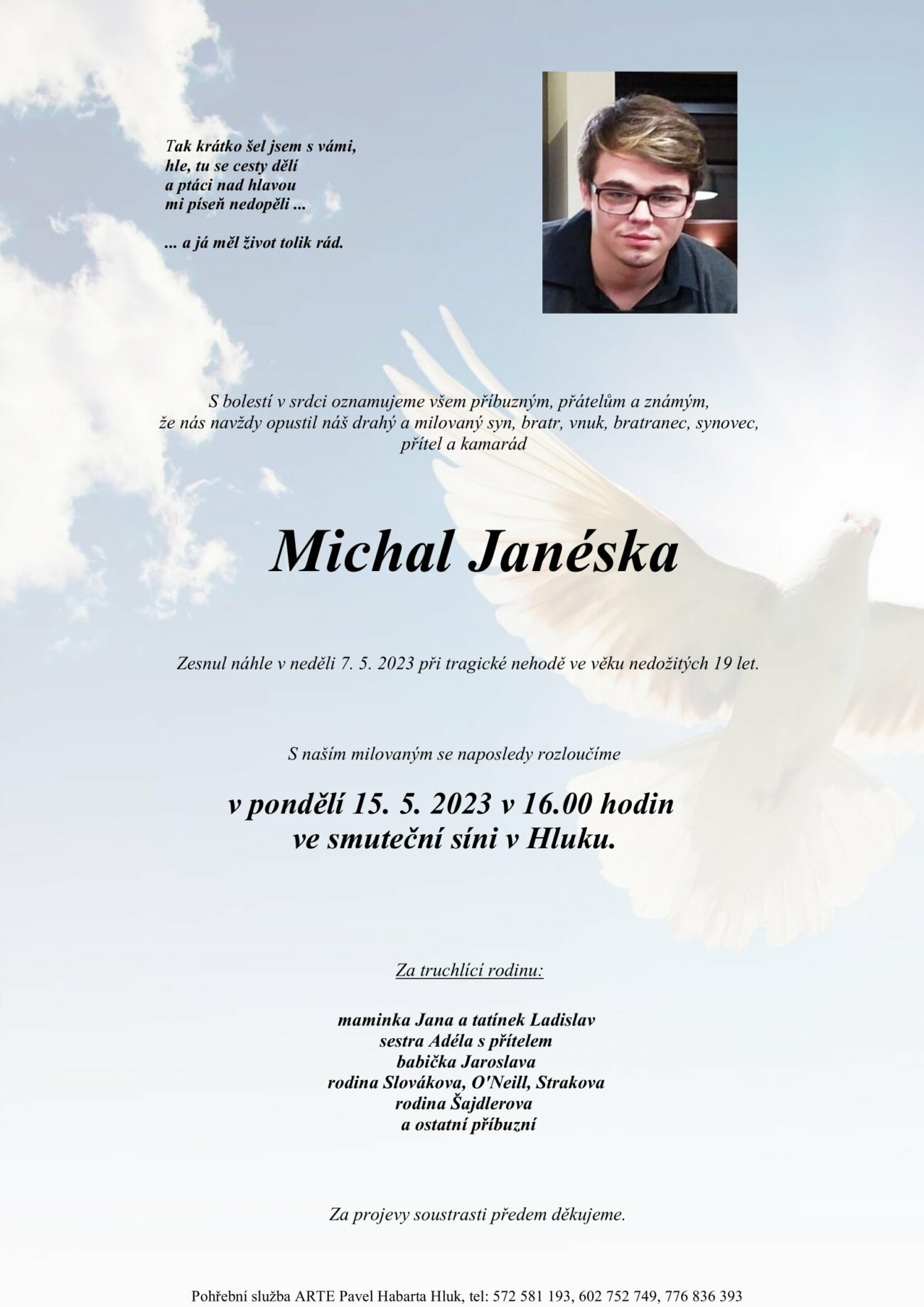 S bolestí v srdci Vám oznamujeme, že nás navždy opustil náš milý student a kamarád Michal Janéska