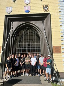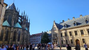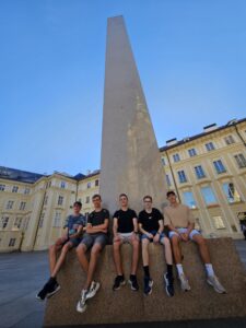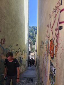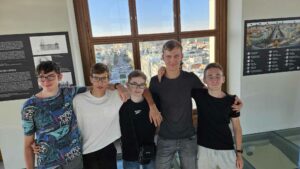 Po ubytování jsme šli na Pražský hrad a pak nás čekal „nýtovaný kolos“ nazývaný Petřínská rozhledna. 299 schodů není žádná sranda … A také jsem zjistil, že nemalá část naší třídy má strach z výšek… Ale pak jsme se nasmáli v zrcadlovém bludišti.