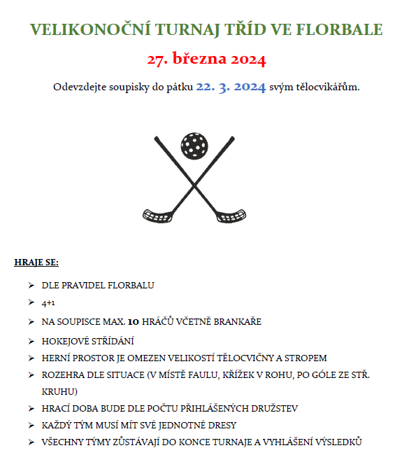 Opět po roce tu máme tradiční velikonoční turnaj ve florbale. Kdo se přidá a zabojuje o medailové pozice?